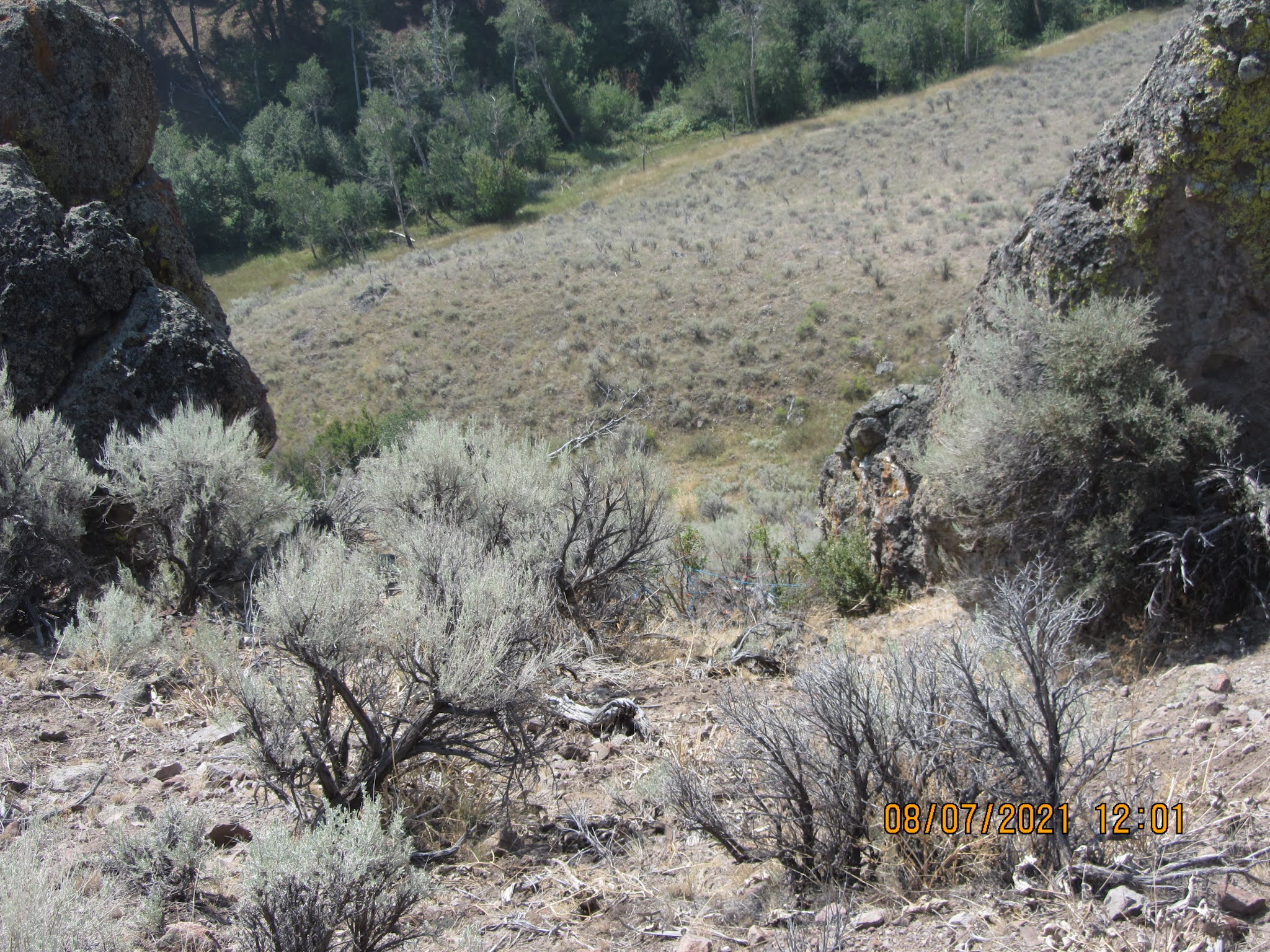 AUGUST 22 – Last Saturday Lynn went with his sister Jenelle to Blackfoot to get a new PTO shaft for a tractor; it broke down while baling her hay. Andrea and I made a fast ride to the 320 to check and make sure no cattle were getting in from the high range side. I took a photo of Andrea looking toward the south fence to see if there were any range cattle on that side of our 320.